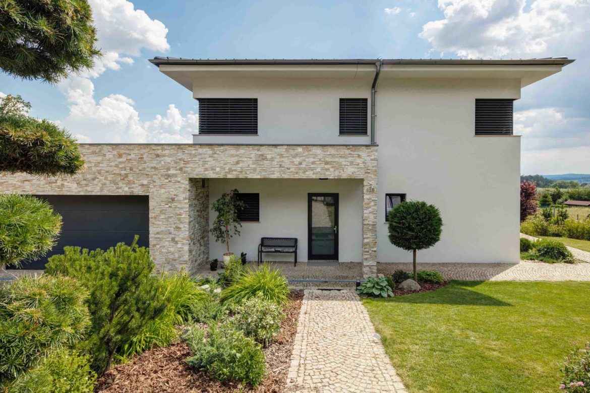 Na tej sa už, naopak, rozkladá typový projekt Bohemia, ktorý si investor vďaka skúsenostiam sám doladil, či už ide o „prifúknutie“ prízemia, alebo voľbu materiálových a farebných kombinácií v podobe kvarcitového kameňa a omietky na fasáde. Alebo detaily, ako je svetlovod v chodbe na hornom poschodí, kde chcel plnými dverami zachovať súkromie v jednotlivých miestnostiach, zároveň sa však nechcel vzdať prirodzeného svetla. Výsledkom je moderne vyzerajúci dom s členitým pôdorysom, dispozične riešený ako 5 + 1, ktorý poskytuje dostatočné súkromie prípadne aj dvom generáciám. Na prízemí je veľká spoločenská miestnosť, ktorá vznikla prepojením obývacej izby s kuchyňou, kde svoje oddelené zázemie má aj svokor (izbu + šatňu). Vďaka zaskleným plochám, ktoré sú v lete dôsledne kryté vonkajšími žalúziami, sú tieto miestnosti dostatočne slnečné a v podstate z každej je možný vstup do záhrady či na terasu. Na prízemí sa nachádza aj priestorná technická miestnosť, v ktorej sa dá rozložiť pingpongový stôl či zacvičiť si, a našlo sa tu aj miesto na saunu. Hlavne sú tu však ukryté tie najmodernejšie technológie vrátane tepelného čerpadla a rekuperačnej jednotky. Poschodie je koncipované ako oddychové zázemie domu, v ktorom je spálňa, detská izba, pracovňa so vstupom na rozľahlú terasu, šatňa aj kúpelňa. A k „vybaveniu“ domu je potrebné prirátať aj vonkajší bazén a hlavne neďaleký les, kde si majiteľ sprevádzaný psom chodí tzv. vyčistiť hlavu. „To ticho tu počujete,“ pochvaľuje si lokalitu.