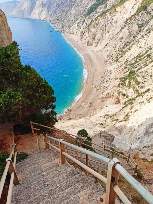 Hovoríme o pláži Platia Ammos, na ktorú viedlo kedysi 300 schodov. Dnes je kvôli zemetraseniu z nich len torzo, a tak tu skončil akýkoľvek turizmus. Avšak našlo sa zopár nadšencov, ktorí zo 100-metrového útesu natiahli rôzne provizórne povrazy a sprístupnili ju tak aspoň tým najodvážnejším, ktorí sa neboja namáhavo zlaniť až dole na pláž. Ak sa vám to podarí, ľahko sa môže stať, že tam s vami nebude celý deň živej duše.